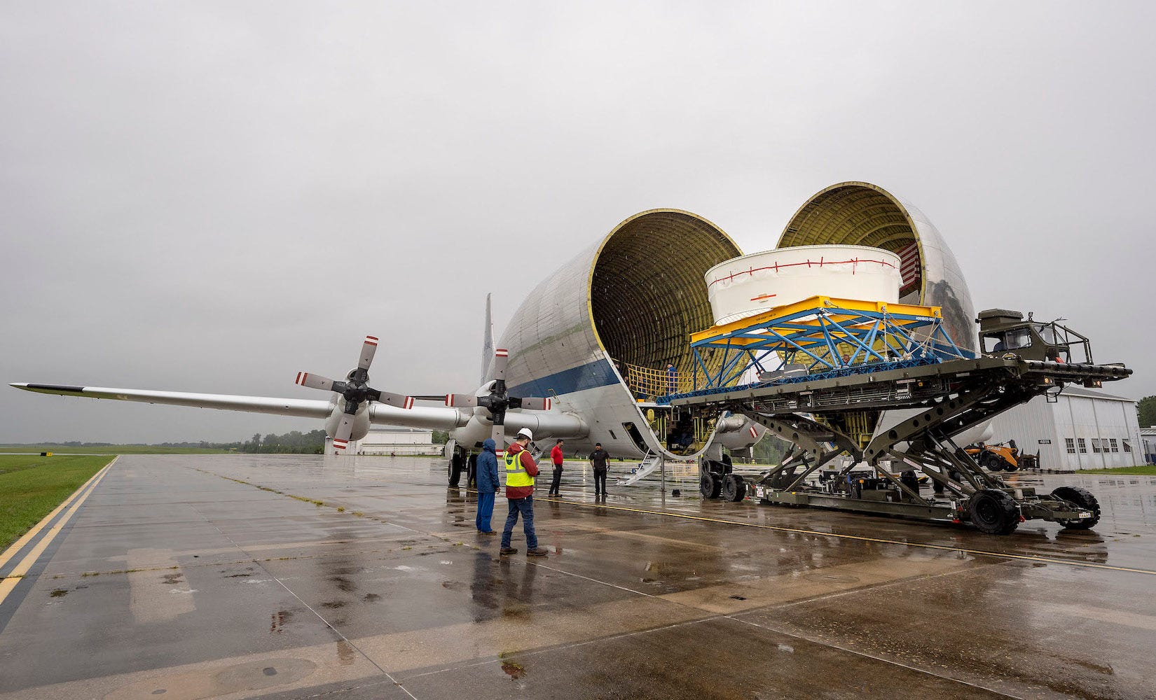 On August 10, a Super Guppy large-cargo-hauling airplane delivered the testing structure of the SLS rocket’s Orion stage adapter (OSA) to Huntsville, whose flight version connects the rocket’s second stage to the Orion spacecraft.
